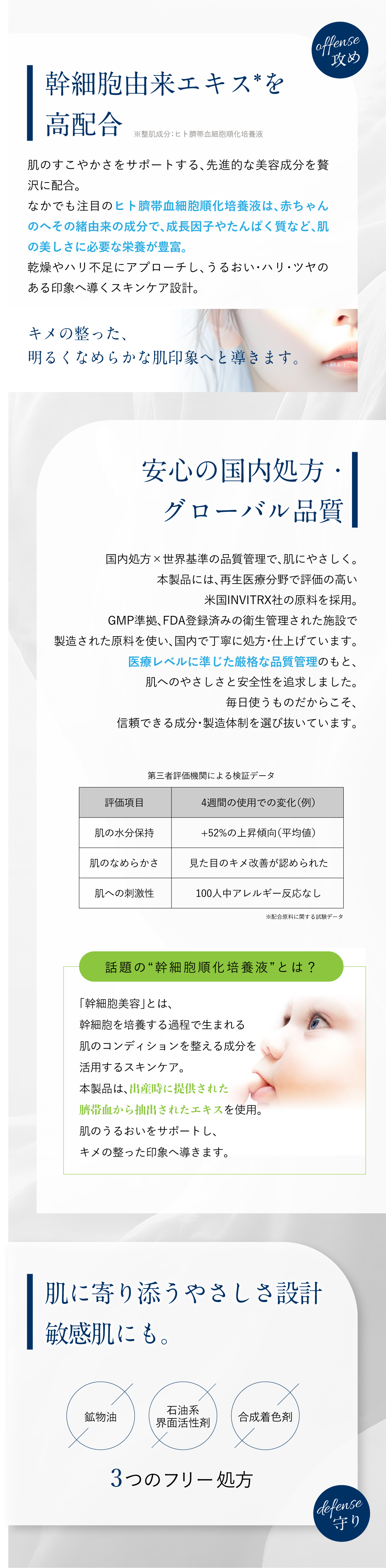 ヒト臍帯血細胞順化培養液、ヒト線維芽細胞順化培養液、ヒト脂肪間質細胞順化培養液の3種のヒト幹細胞培養液を贅沢に配合。